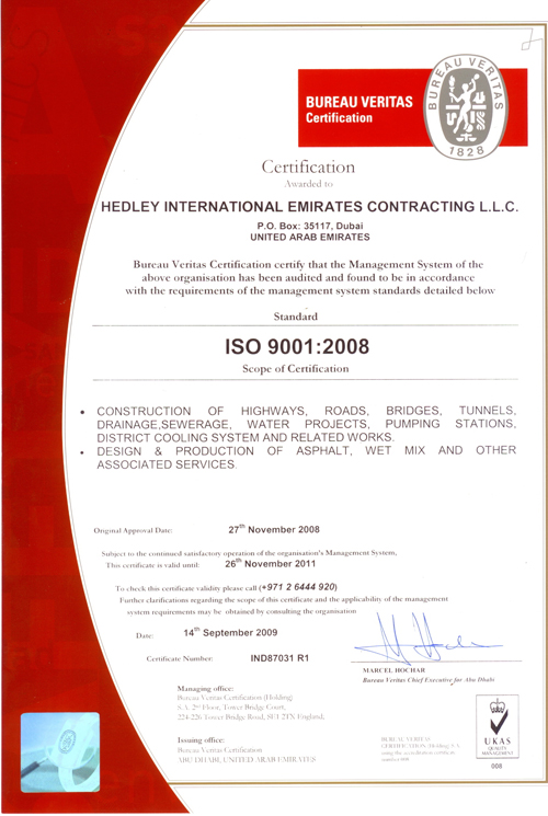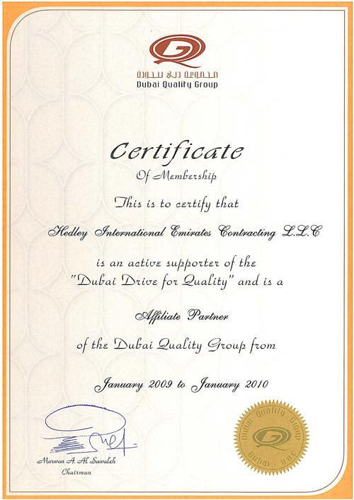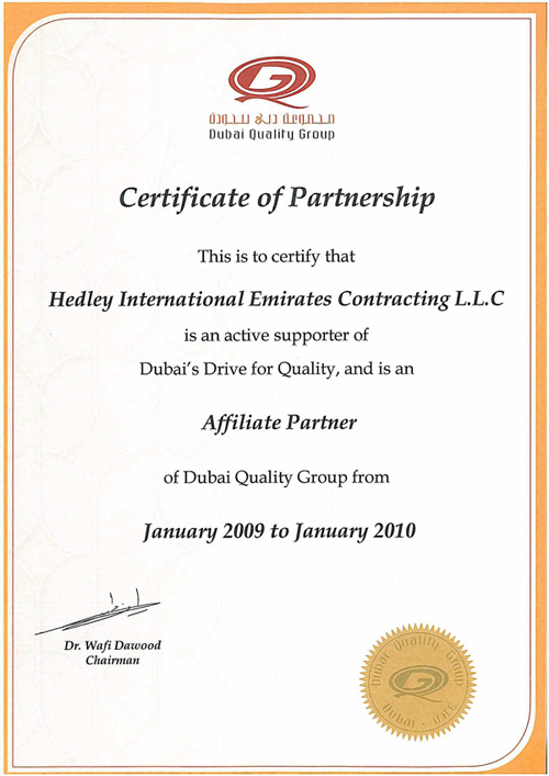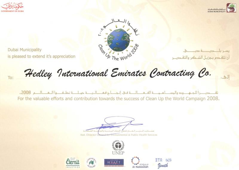 ISO 9001:2008Hedley International Emirates Contracting LLC has achieved ISO 9001:2008 for higher quality services. Through ISO 9001:2000, Hedley will achieve its objective in management as well as improving its service and quality in construction.Scope of certification includes: What is ISO 9001? ISO 9001 is an international Standard. It's one of the most widely known and internationally accepted models for a quality system, and the basis of many very effective quality systems. ISO 9001 is a generic Standard that can be applied to any size of company or organization, in any industry or field in any country, regardless of the type of product or service. The ISO 9000 family is primarily concerned with "quality management". This means that the organization fulfills: ![]() Dubai Quality GroupDubai Quality Group has been set up as a non-profit making organization with the main objective of providing a basis for the exchange of knowledge among the business community. Through its programme of events, workshops, seminars, conferences and publications it provides organizations with the opportunity to align their management techniques with world-wide best practice, thus promoting Dubai as a quality and efficiency-focused business hub in the region.Clean up the World 2008Pertaining to Chairman & C.E.O. precious directive to clean up the project sites and the surrounding vicinity and in appreciation of company's effort for achieving this goal, we are proud to announce that Hedley International Emirates Contracting Company have received a certificate from the "Government of Dubai" and "Dubai Municipality" against our contribution in "Clean Up The World Campaign 2008". |